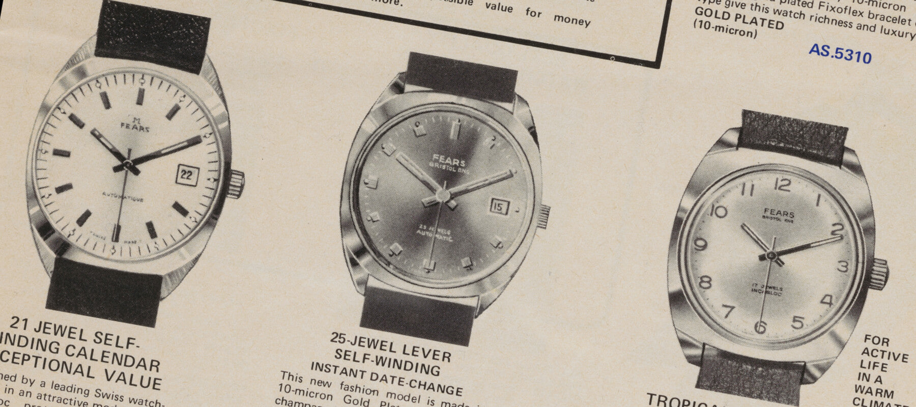 Fears celebrates its centenary with a special collection of wrist watches for men and women. A full-page advert in the Bristol Mercury tells the story of Fears from mid-Victorian to mid-century watchmaker.