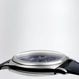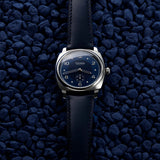 This clever optical illusion is achieved through three layers and two surface finishes combined with a galvanic blue coating. The hand-brushed ring where the numerals sit is unique to each watch, changing colour in the light.
