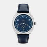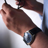 The Brunswick Blue’s distinctive ‘Fears’-shaped hands are finished by a watchmaker, giving them a depth and detail not found in mass-produced, stamped watch hands. Each set of hands is subtly skeletonised before being polished to a mirror shine and plated in Rhodium to match the numerals.