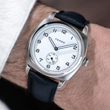 The Brunswick 38 Polar White features a hand-polished white lacquer dial, expertly made in Germany by one of the world’s finest dial makers. After several layers of white lacquer are applied, multiple layers of crisp black ink bring the dial to life using a numeral set first used by Fears in 1946.