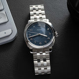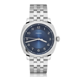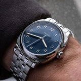 The Brunswick 40 Blue features a Fears Blue dial with a unique deep blue using a special galvanic coating.