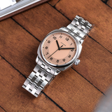 - Dial: Salmon colour, with black printing and hand applied numerals