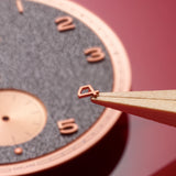 The hour and minute hands feature a lightly frosted finish before receiving their coating of 18ct rose gold to perfectly match the polished 3D numerals, whereas the seconds hand is coated in contrasting black varnish.