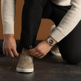 Heritage Brown in Cordovan leather, lined in Alcantara®, handmade. Strap hand-made in Belgium ---------------------------------------------------------------- Bespoke 5-link bracelet in stainless steel, dual finishing with polished and brushed elements. Standard and shorter links fitted to achieve a fine adjustment fit. Butterfly folding clasp. Easy-release spring bars. Made in Hong Kong |