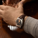 The Brunswick 38 'Charcoal Rose' is fitted with a handmade Chestnut Brown strap crafted from the finest Cordovan leather with premium fold-over edges. This exceptional leather represents the art of tanning at it's finest and is sourced from the shell membrane of a horsehide that is ordinarily reserved for the worlds finest shoemakers.