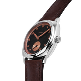 The Brunswick 38 'Charcoal Rose' features iconic ‘Fears’-shaped hands expertly made in Germany, they are milled from solid brass with a bevel cut down the centre using a diamond tool.