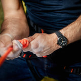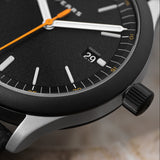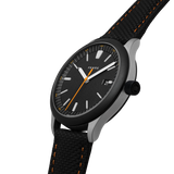 The Redcliff 39.5 'ES' is fitted to an FKM rubber strap in Carbon Black (finished with a vivid orange contrast stitching) moulded to look like it's woven. The application of FKM rubber retains the classic aesthetic of sailcloth whilst modernising the feel and durability which results in a strap that is supremely comfortable but also extremely hard-wearing.