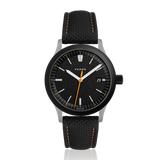 Dial size: 33 mm / 0.4 inch Carbon Black. Textured dial with stepped rehaut. White and orange printing Moulded block lume baton indices (moulded from X2-Grade Super-Lumi Nova) and hand applied. Made in Germany |