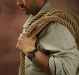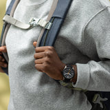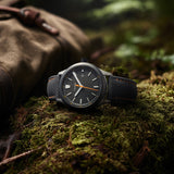 Each part of the case (including the buckle) have first been frosted before undergoing a special hardening treatment to achieve an uprated 2,000 Vickers (9x the hardness of standard 316L Stainless Steel) that renders this Fears' tool watch practically indestructible. The most exposed components (bezel, crown and exhibition caseback) have also been given a DLC (Diamond-Like Carbon) coating to further enhance durability and scratch-resistance.