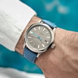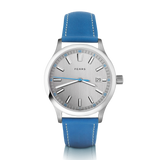 Each Redcliff 39.5 Date Pewter Grey can be fitted with a handmade Azurro Blue strap crafted from Barenia leather. Presented in Azzuro Blue, an Italian-named vibrant colour that is halfway between blue and cyan (perfectly complementing the seconds hand). The blue has a contrasting platinum stitch that enhances the summery feel of the strap.