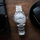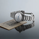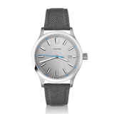 - Dial: Pewter Grey, vertically brushed, black printing with cyan accents