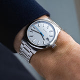 The Redcliff 39.5 Date comes with both a bespoke 3-link stainless steel bracelet or a Azurro blue barenia leather strap, and with either choice will also be accompanied by and a 3D-woven textile strap.