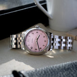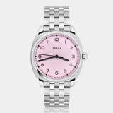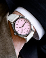 The Brunswick 40 Flamingo Pink features a Flamingo Pink dial in what could almost be described as the perfect shade of pink.