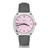 Each Brunswick 40 Flamingo Pink can be fitted with a handmade Pewter Grey strap crafted from Barenia leather with darker grey stitching, lending a contemporary feel to the watch.