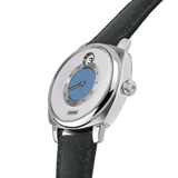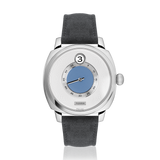 The Brunswick 40.5 Jump Hour 'China Blue' is offered on a handmade Storm Grey Alcantara® strap (a cutting-edge material developed in Italy that offers unrivalled aesthetic, technical and tactile qualities), that despite what the name may suggest provides a calm contrast.