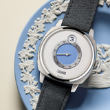 nspired by classic Stoke-on-Trent pottery with its distinctive pale, matte blue and high contrast white. The sophisticated blue centre is combined with a fine 3D barleycorn patterned offering a calm face to this timepiece. Balancing the hour window on the upper side of the dial is a finely brushed and bevelled plate set into the lower side of the dial bearing the Fears name.