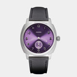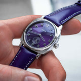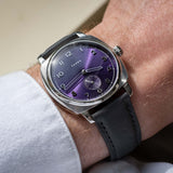 Royal Purple. Purple lacquered colour. Sunburst brushing to surface, with sunken subsidiary seconds counter at 6 o’clock. CNC milled and diamond polished ‘Edwin’ Arabic numerals, coated in Rhodium and hand applied.
