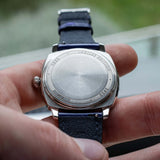 The Brunswick ’Jubilee Edition’ is presented in a bespoke wooden box, crafted in Britain from English Ash, which is stained Fears Blue. Lined in genuine cream suede, the watch sits proudly on a special cushion.