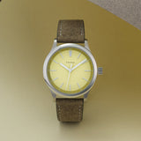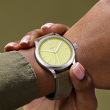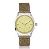 The Sherbert Yellow features a lighter yellow matte-lacquer inner dial and a darker yellow outer dial with a white printed minute track (and the subtle inclusion of lume on each of the 5-minute numerals). Taking its inspiration from the tangy sherbert confectionary loved by many as a child (and adult!).