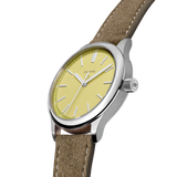 The Redcliff 39.5 Sherbert Yellow is offered on a handmade Flax Alcantara® strap, this unique khaki shade and texture tonally matches the minute track whilst perfectly complementing the main section of the dial.